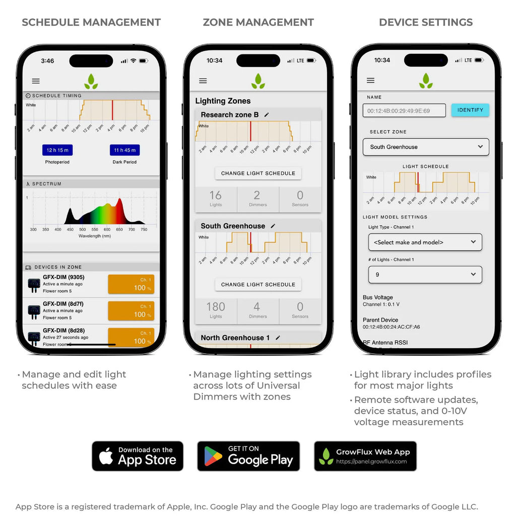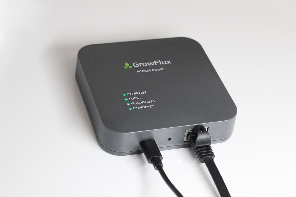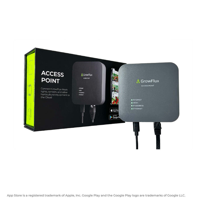 The GrowFlux Access Point, available from Horticulture Lighting Group, is a central component for securely connecting GrowFlux products to the cloud, designed specifically for controlling horticultural lighting and sensor systems. This device supports a substantial network capacity, capable of managing up to 1,000 fixtures and sensors. It utilizes the AetherMesh Sub-GHZ 6LoWPAN wireless protocol, which offers impressive range: over 500 feet indoors, even through walls, and more than 1 mile with a line of sight, making it suitable for large commercial growing operations. The Access Point features an internal high-performance antenna and a 10/100 Ethernet port for local network connectivity.