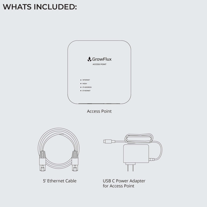 Setting up the GrowFlux Access Point is straightforward, as it is engineered for broad compatibility with standard Ethernet networks and requires no special configuration in most scenarios. For secure operation, the device employs AES128 encryption for all wireless communications and SSL encryption for all Ethernet communications. Furthermore, it prioritizes network security by only using outbound TCP requests on port 443, ensuring compatibility with common firewall configurations and preventing unauthorized inbound access. The device includes a 5V power adapter, a 5-foot Ethernet cable, and a quick-start guide, positioning it as a robust and secure solution for advanced grow room management.
