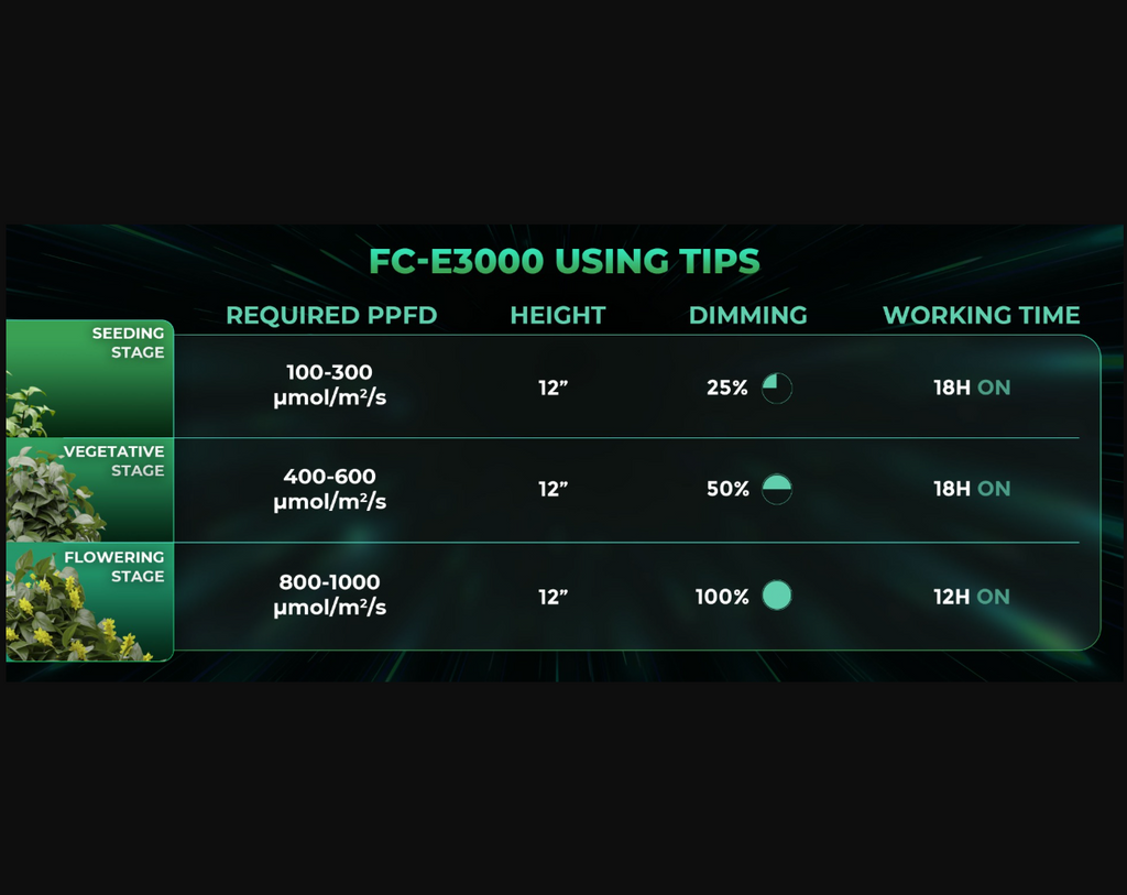 Built with a full spectrum tailored for all plant growth stages, the FC-E3000 is suitable for both commercial and home horticulture across soil, hydroponic, or grow tent environments. Its smart features include a dimming knob for easy 10%-100% intensity adjustments and daisy-chain capability to control up to 30 lights from a single unit. Furthermore, when used with an external smart controller (sold separately), it unlocks mobile app control, allowing for programmable dynamic lighting, simulated sunrise and sunset, and custom growth schedules, making it a versatile and modern lighting solution.
