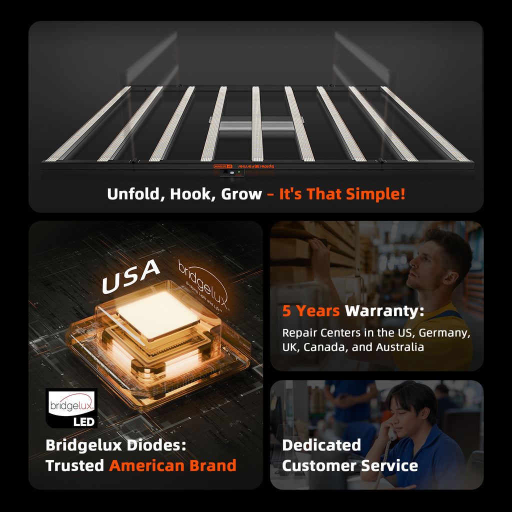 Equipped with advanced smart technology, the G1200W features integrated WiFi and Bluetooth connectivity for seamless remote management via the Spider Farmer App. Growers can easily automate their environment by scheduling precise light cycles, simulating natural sunrise and sunset effects, and adjusting dimming levels from anywhere. The robust, foldable bar design not only ensures optimal heat dissipation but also allows for easy installation and storage, making it an ideal choice for both hobbyists and commercial vertical farming operations.