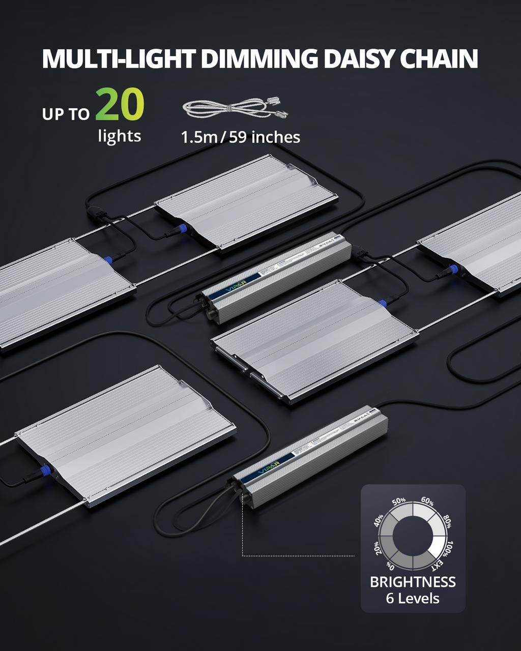 The XS3000 Pro is a powerful yet energy-efficient solution, drawing only 300W of power while being capable of replacing traditional 500W to 600W HPS/MH systems, resulting in significant cost savings. For scalability and user convenience, it is equipped with a dimmable feature (0-100% via a knob) and a Daisy Chain function, allowing up to 20 units to be connected and synchronized for unified light control, which is ideal for commercial, vertical, or greenhouse growing. Furthermore, the unit boasts superior durability and thermal management through a silent, fanless operation and large, solid aluminum heat sinks, which ensure efficient heat dissipation, protect plants from stress, and contribute to an extended lifespan of up to 100,000 hours
